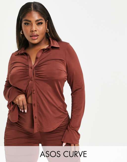 ASOS DESIGN Curve slinky slim fitted shirt with ruching in rust