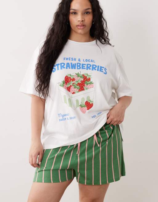 ASOS DESIGN Curve strawberry oversized tee and stripe short pyjama set in cream