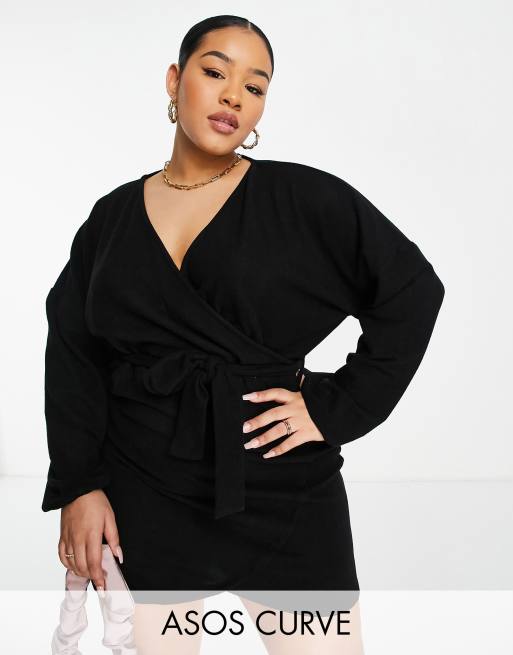 ASOS DESIGN Curve super soft balloon sleeve wrap mini dress in black