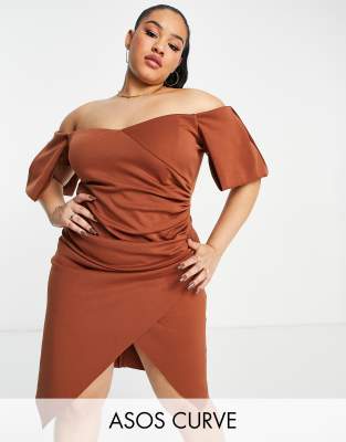 ASOS DESIGN Curve sweetheart neck wrap tuck off shoulder bardot midi dress in caramel