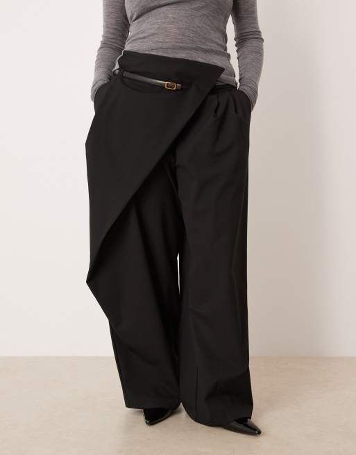 ASOS DESIGN Curve tailored wide leg wrap belted trousers in black