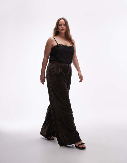ASOS DESIGN Curve textured velvet tailored wide leg trouser in chocolate