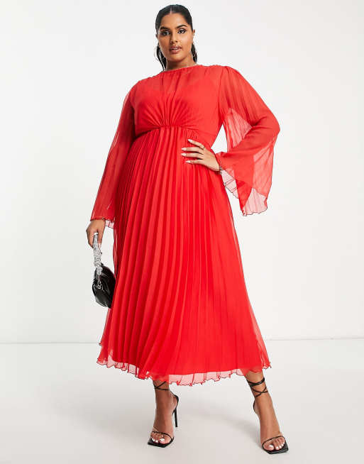ASOS DESIGN Curve tie back fluted sleeve pleated midi dress in red