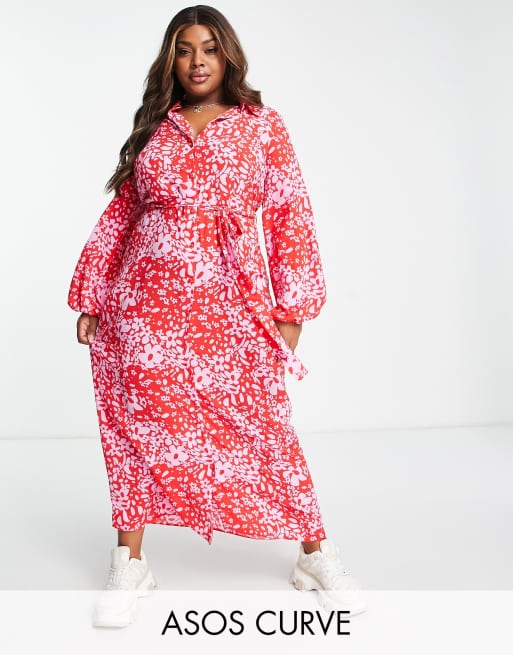 ASOS DESIGN Curve tie front shirt dress in red daisy print