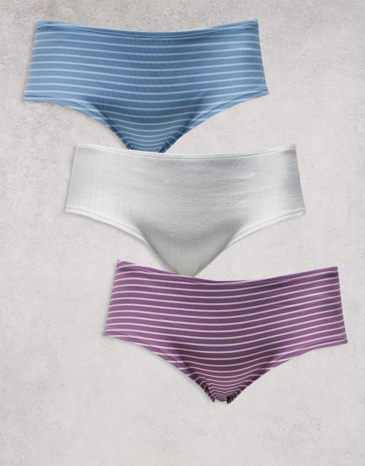 ASOS DESIGN Curve Tori 3 pack hipster brief in blue & purple stripe and white pointelle
