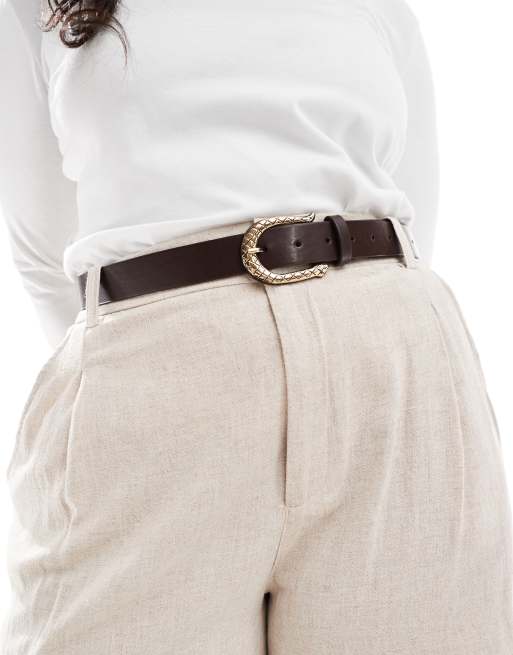 ASOS DESIGN Curve waist and hip jeans belt with gold snake buckle in brown