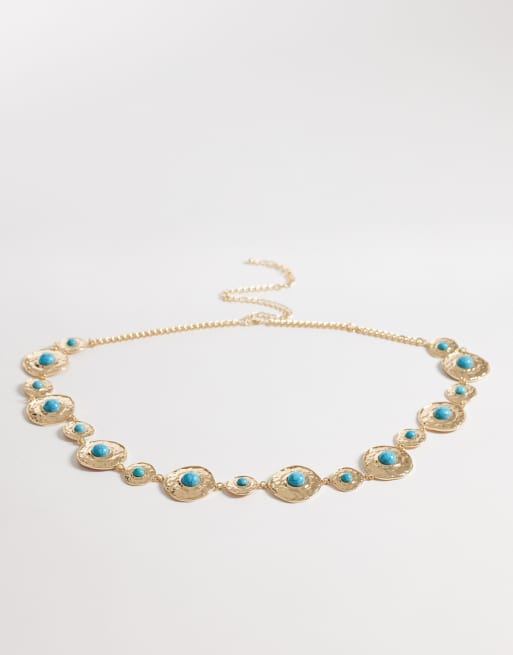 ASOS DESIGN Curve waist and hip turq stone set chain belt in gold