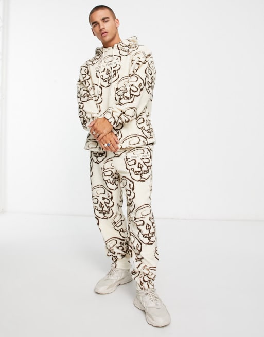 ASOS Dark Future co-ord relaxed in teddy borg with all over skull print in ecru