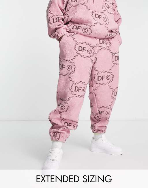ASOS Dark Future co-ord relaxed joggers in teddy borg with all over monogram logo print and embroidery in pink