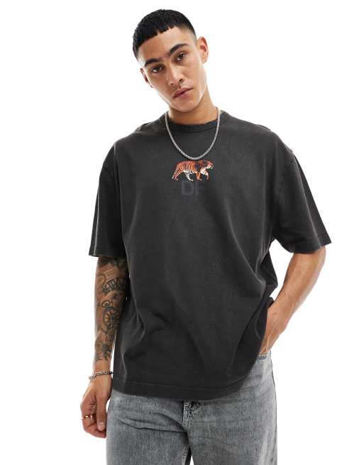ASOS Dark Future oversized t-shirt in washed black with tiger chest print
