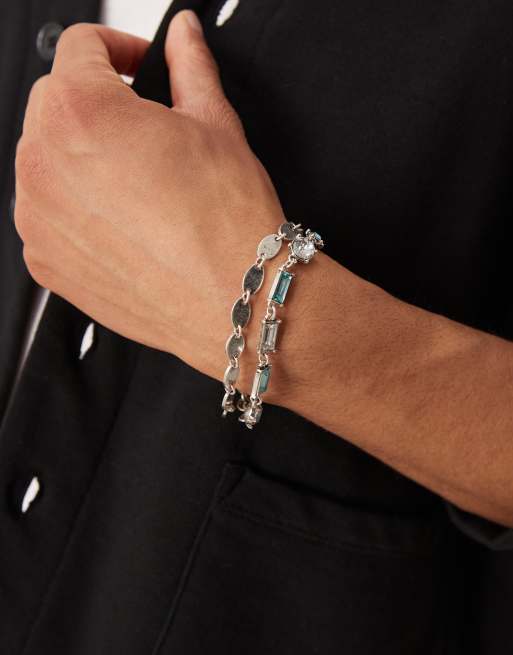 ASOS DESIGN 2 pack bracelet with crystals and hammered oval links in silver