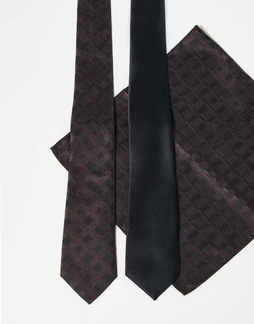 ASOS DESIGN 2 pack geometric print tie and pocket square in black and brown