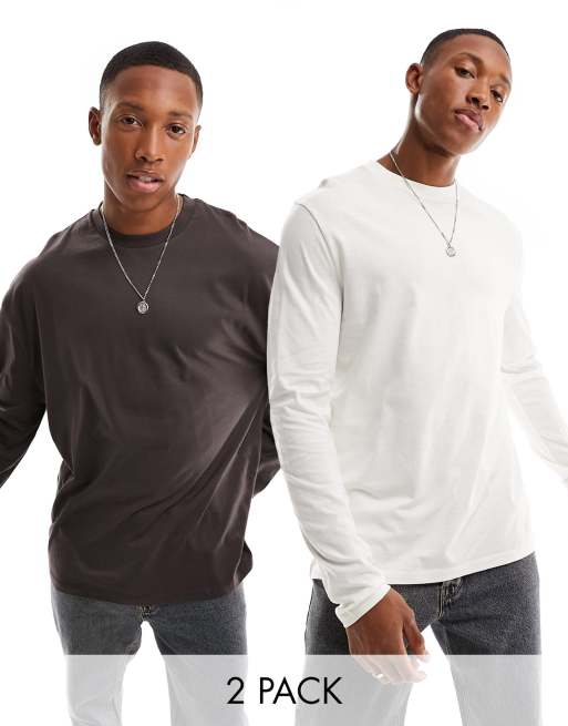 ASOS DESIGN 2 pack long sleeve crew neck t-shirts in ecru and brown