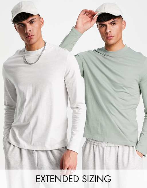 ASOS DESIGN 2 pack long sleeve t-shirt with crew neck in white and khaki