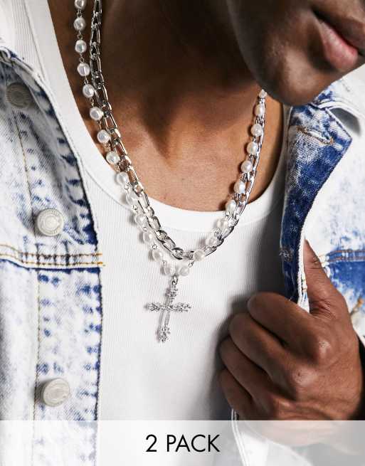 ASOS DESIGN 2 pack neck chain set with faux pearls and cross pendant in silver tones