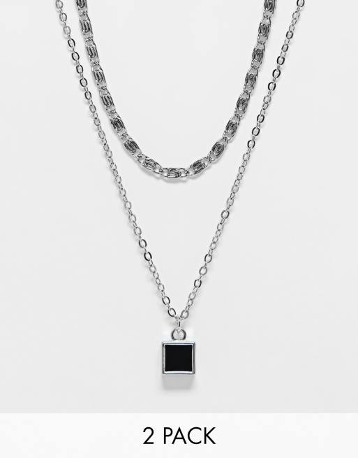 ASOS DESIGN 2 pack necklace with black square pendant in silver