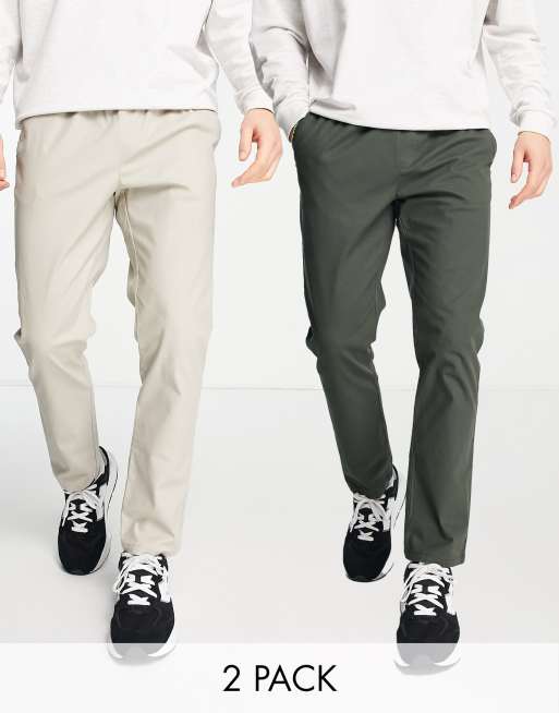ASOS DESIGN 2 pack slim chinos with elastic waist in dark green & beige save