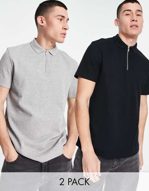 ASOS DESIGN 2 pack waffle polo with zip in black and grey marl