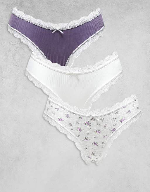 ASOS DESIGN 3 pack brazilian brief in white, mauve & ditsy print with lace trim