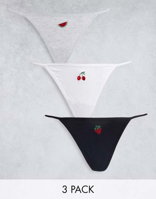ASOS DESIGN 3 pack cotton t-back thong with fruit embroidery in black grey & white