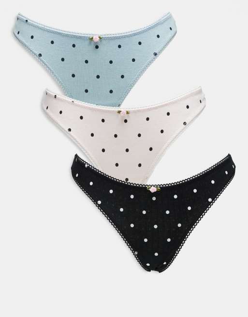 ASOS DESIGN 3 pack high leg thong in pointelle with polka print in pink, blue & black