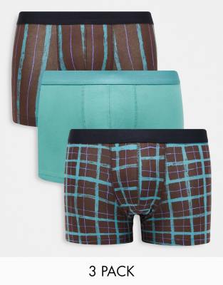 ASOS DESIGN 3 pack jersey trunks in green stripe and check