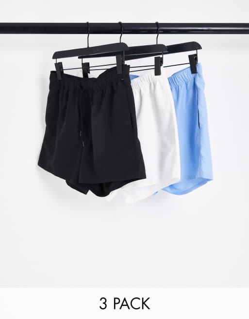 ASOS DESIGN 3 pack swim shorts in short length in pastel blue/white/black SAVE
