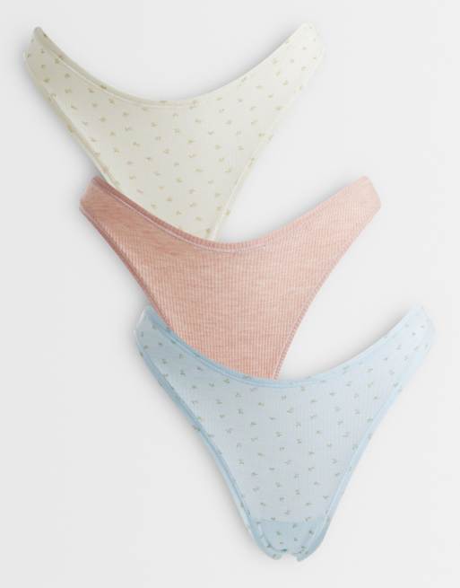 ASOS DESIGN 3 pack thong in blue & cream ditsy print and oatmeal rib