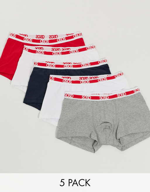 ASOS DESIGN 5 pack short trunks in multi colours with red waistband