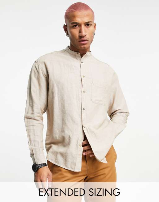 ASOS DESIGN 90s oversized linen shirt with grandad collar in stone