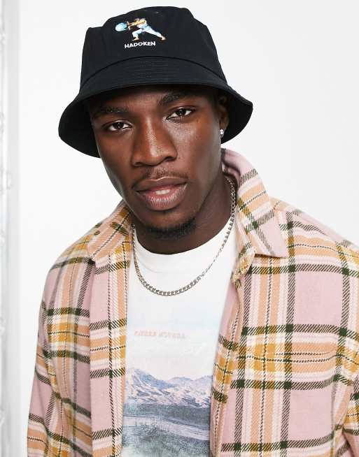 ASOS DESIGN 90's Retro Street Fighter Ryu bucket hat in black with hadouken print