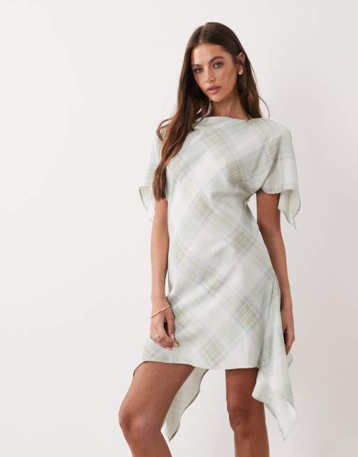 ASOS DESIGN angel sleeve flippy mini dress in green check