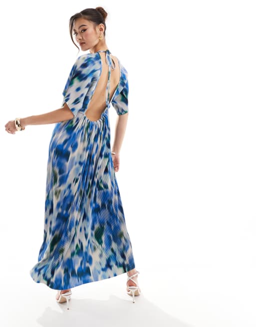 ASOS DESIGN angel sleeve plisse maxi dress with trapeze hem in blue print