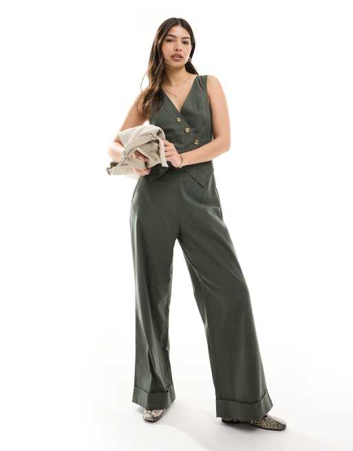ASOS DESIGN asym waistcoat 2 in 1 jumpsuit in khaki