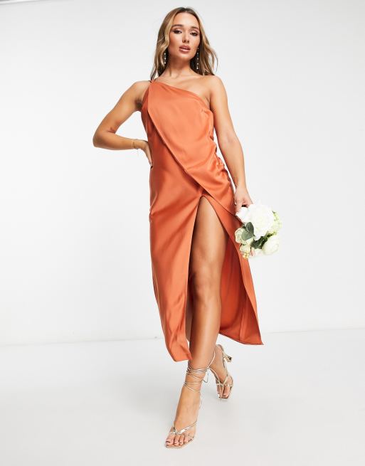 ASOS DESIGN asymmetric overlay midi dress with front split in rust