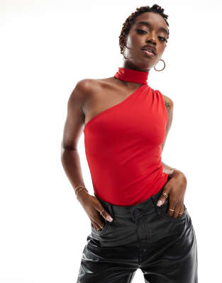 ASOS DESIGN asymmetric slinky bodysuit in red - RED