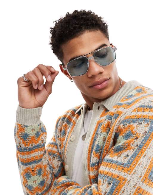 ASOS DESIGN aviator sunglasses with silver frame and blue lens
