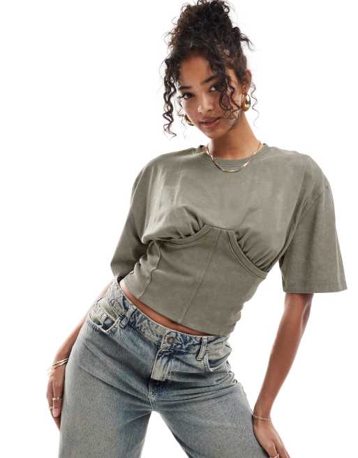 ASOS DESIGN baby tee with corset underbust waist in washed green