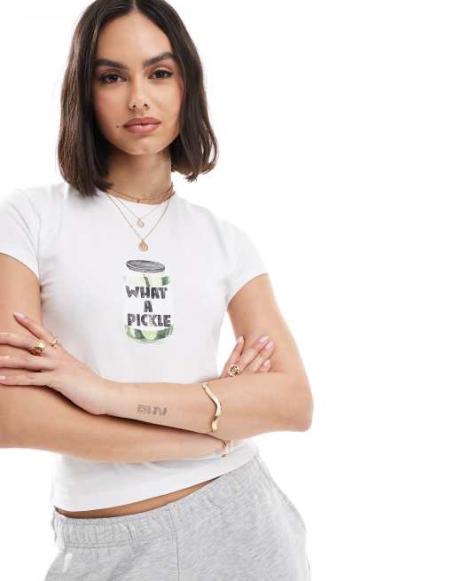 ASOS DESIGN baby tee with what a pickle jar graphic in white