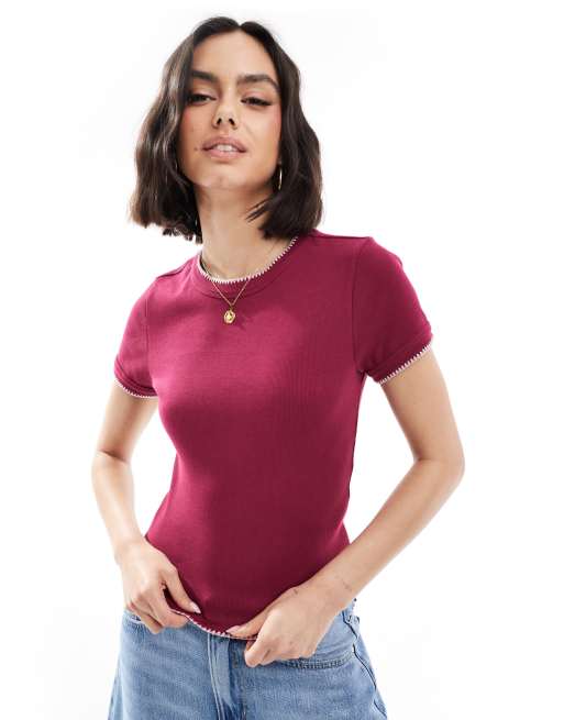 ASOS DESIGN babytee with blanket stitch detail in burgundy