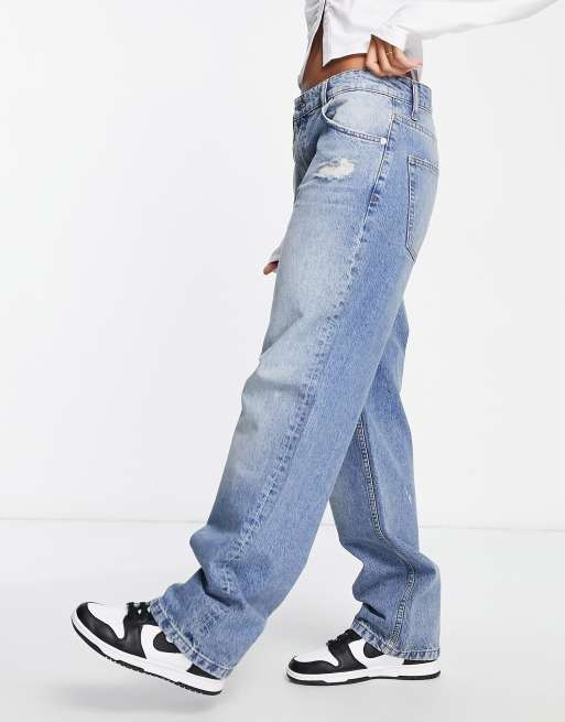 ASOS DESIGN baggy boyfriend jeans with thigh rip in mid blue