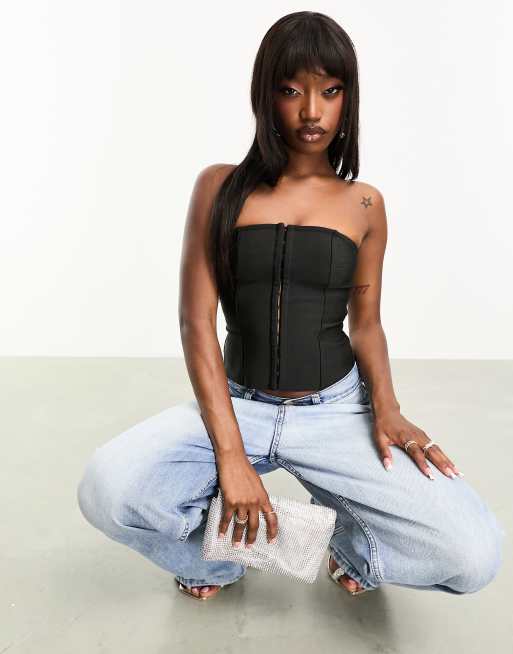 ASOS DESIGN bandage corset top with hook and eye fastening in black