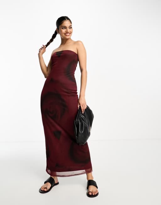 ASOS DESIGN bandeau mesh printed bandeau midi dress in rose print