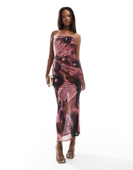ASOS DESIGN bandeau midi dress with drape mesh bodice in pink abstract print