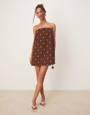 ASOS DESIGN bandeau trapeze mini dress in choc polka dot