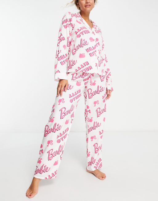 ASOS DESIGN Barbie x Hello Kitty modal shirt & trouser pyjama set in white & pink