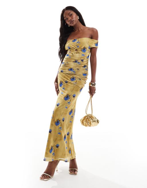 ASOS DESIGN bardot mesh drape midi dress in blurred yellow floral print
