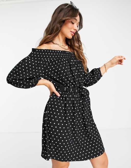 ASOS DESIGN bardot mini dress with a belt in mono spot print