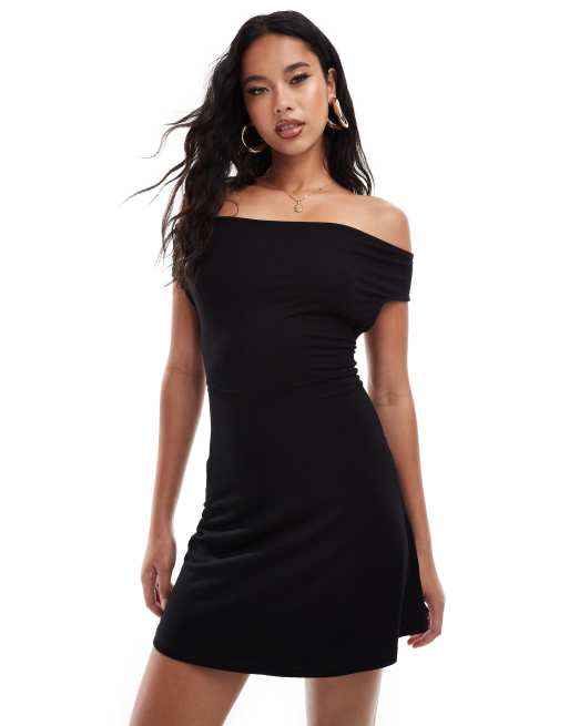 ASOS DESIGN bardot mini dress with flippy skirt and cut out back black