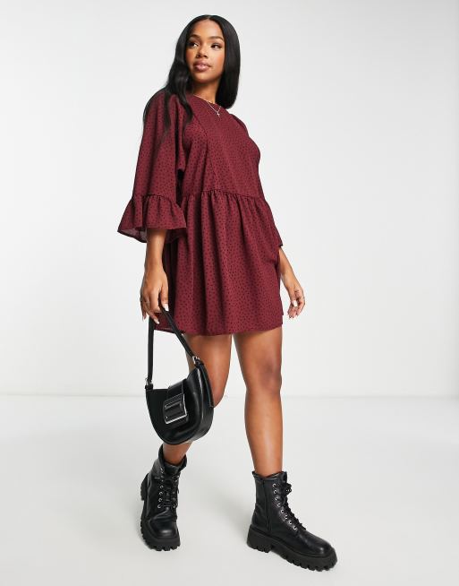 ASOS DESIGN batwing sleeve smock mini dress in burgundy base black spot